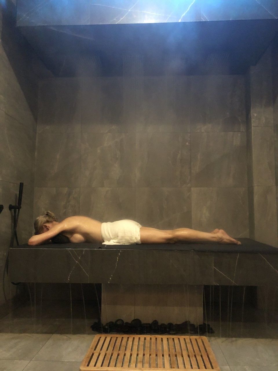 The therapist will pour warm water over the skin and apply black Moroccan soap (beldi soap)